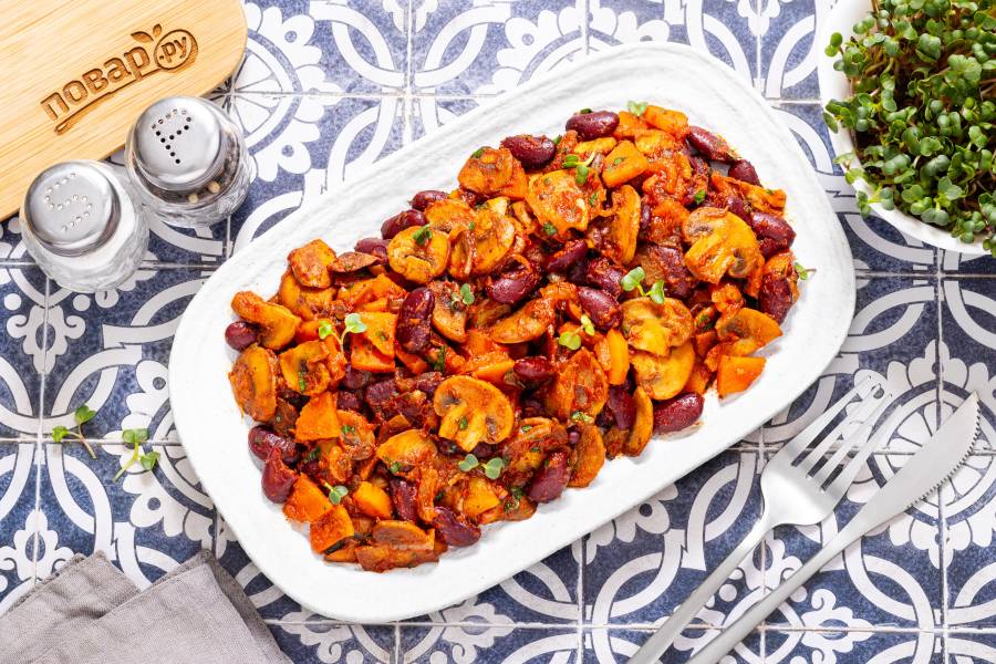 Простое, но вкусное блюдо из консервированной красной фасоли с шампиньонами. Подавать его можно как в горячем, так и в холодном виде, в качестве основного блюда или закуски.