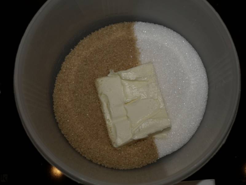 Масло смешиваем с белым и коричневым сахаром, взбиваем миксером до получения однородной массы.