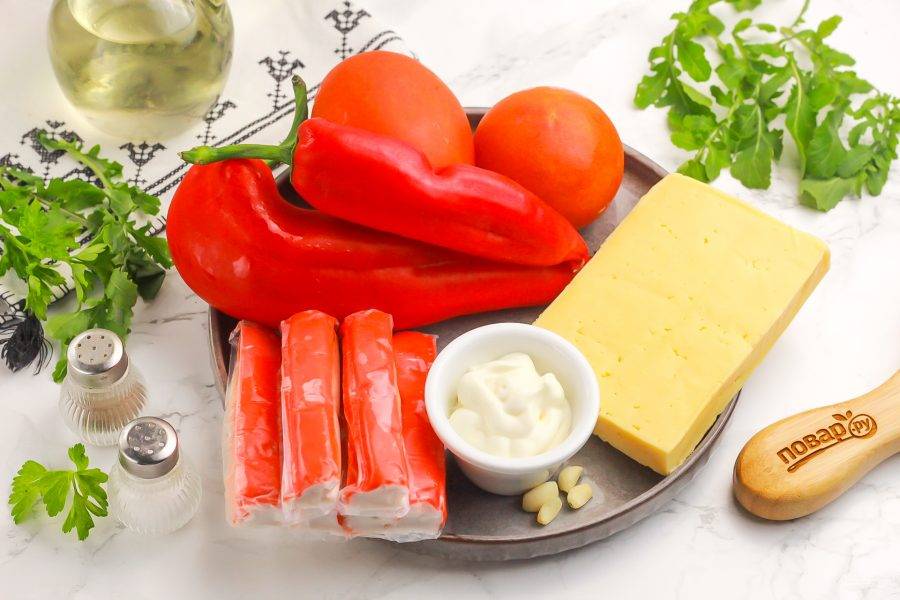 Подготовьте указанные продукты. Крабовые палочки заранее разморозьте, если приобретали их замороженными. Овощи промойте в воде и обсушите бумажными салфетками.