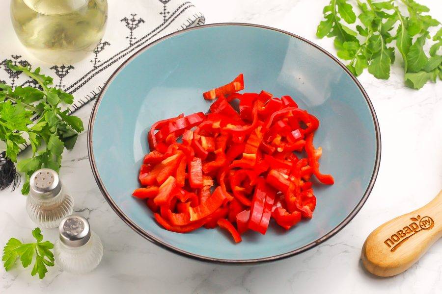 Срежьте с болгарских перцев крышечки и удалите семена. Нарежьте мякоть лентами, брусочками и выложите в салатник.