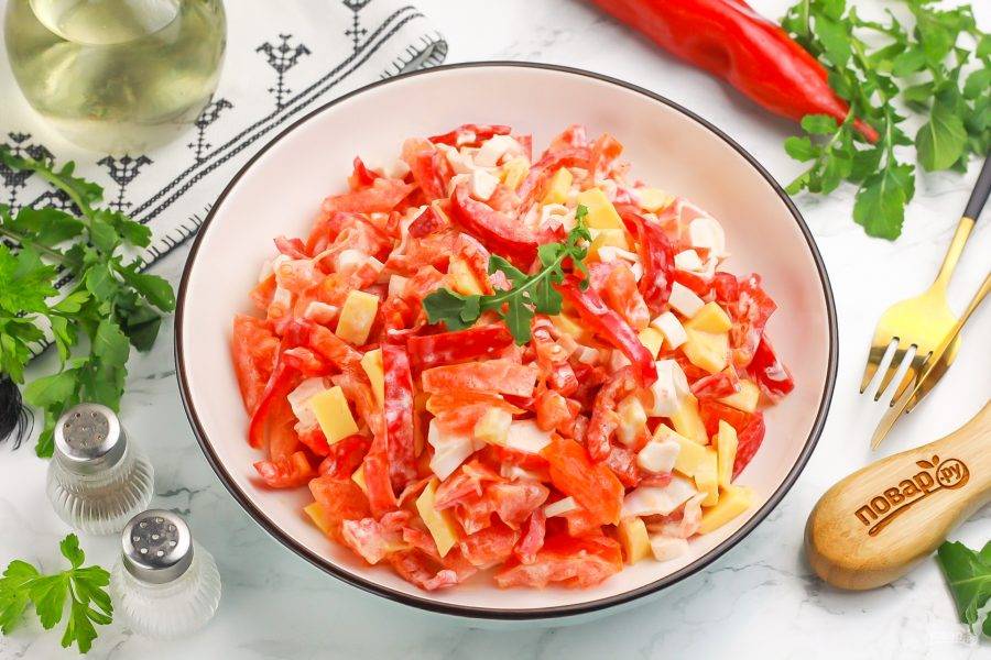 Салат готовится из нескольких продуктов красного цвета, поэтому и получил такое необычное название. Особенно ярко вкус ингредиентов подчеркивает твердый сыр и свежий чеснок. Обязательно попробуйте!