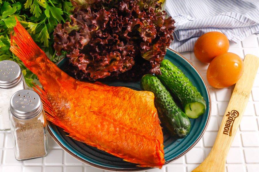 Имея в наличии такую вкусную рыбу, как копченый морской окунь, очень легко и быстро можно приготовить вкусное блюдо, например — салат. Остальные продукты добавьте по своему вкусу: салат, огурцы, яйца.