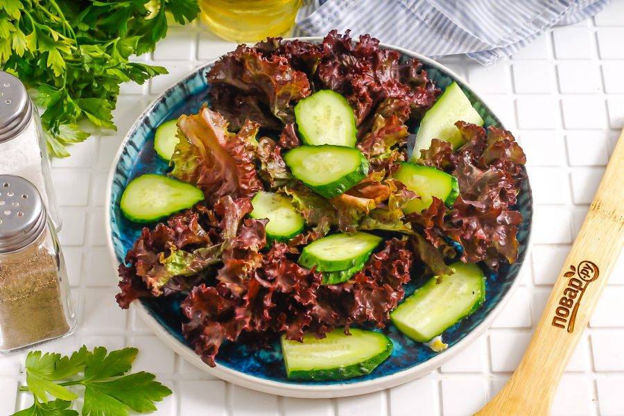 Промойте листья салата и стряхните с них влагу. Выложите на тарелку. По желанию можно нарвать их руками на меньшие кусочки. Промойте огурцы в воде и срежьте хвостики, нарежьте их слайсами и выложите на тарелку.
