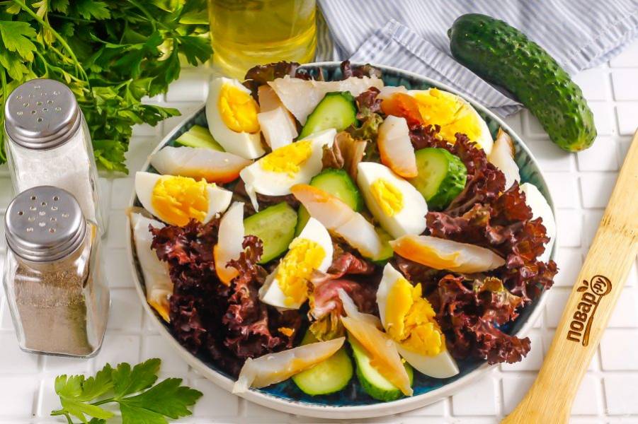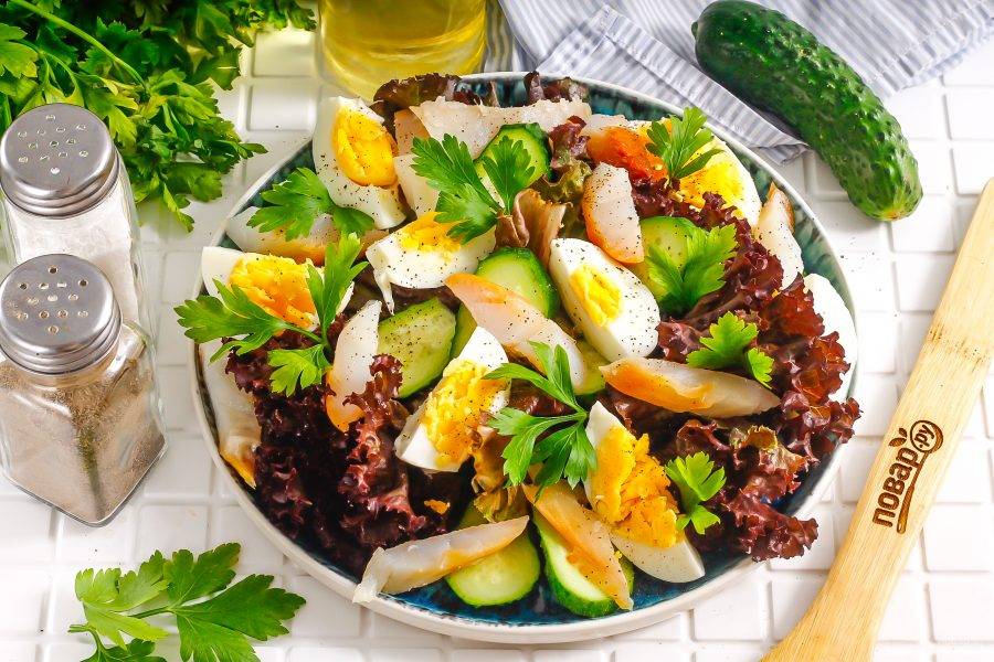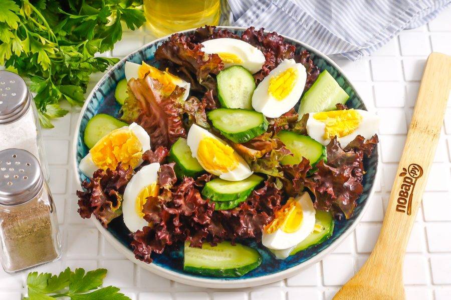 Очистите отварные куриные яйца от скорлупы, промойте в воде и нарежьте четвертинками. Выложите на листья салата.