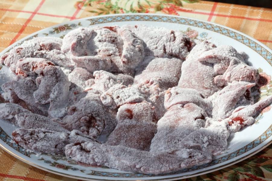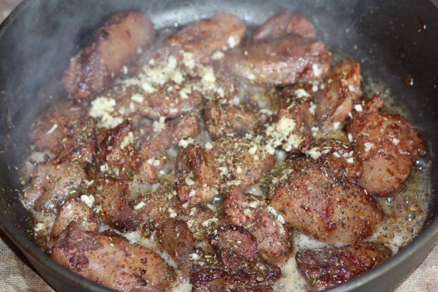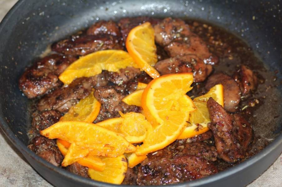 Обжариваем на той же сковороде, что и апельсины (печень пропитается их соком). Когда печень подрумянится с двух сторон, добавляем травы, соль, перец и чеснок.