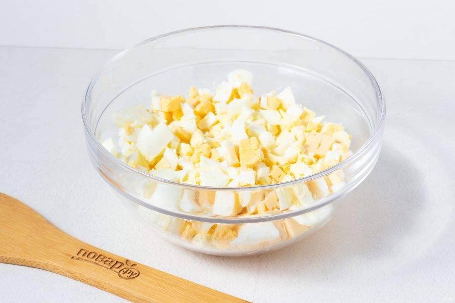 Подготовьте все необходимые ингредиенты. Яйца отварите и остудите.