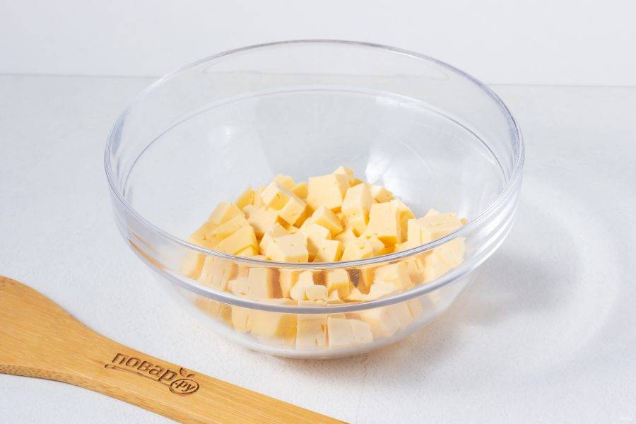 Сыр нарежьте небольшими кубиками и выложите в салатник.