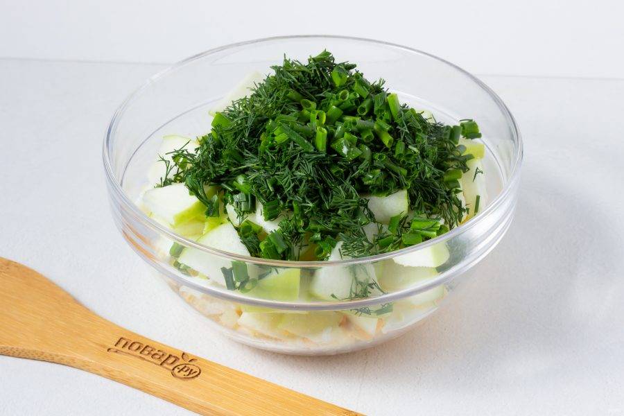 Добавьте рубленную зелень, заправьте сметаной и посолите по вкусу.