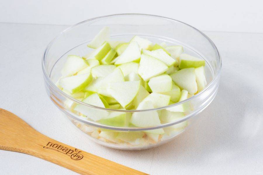 Яблоко нарежьте небольшими кусочками. Добавьте в салат.