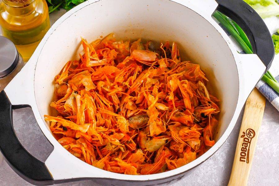 Всыпьте панцири креветок или крабов, раков и т.д.