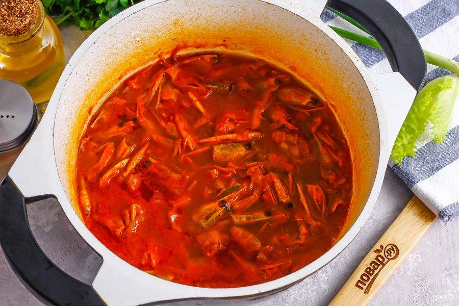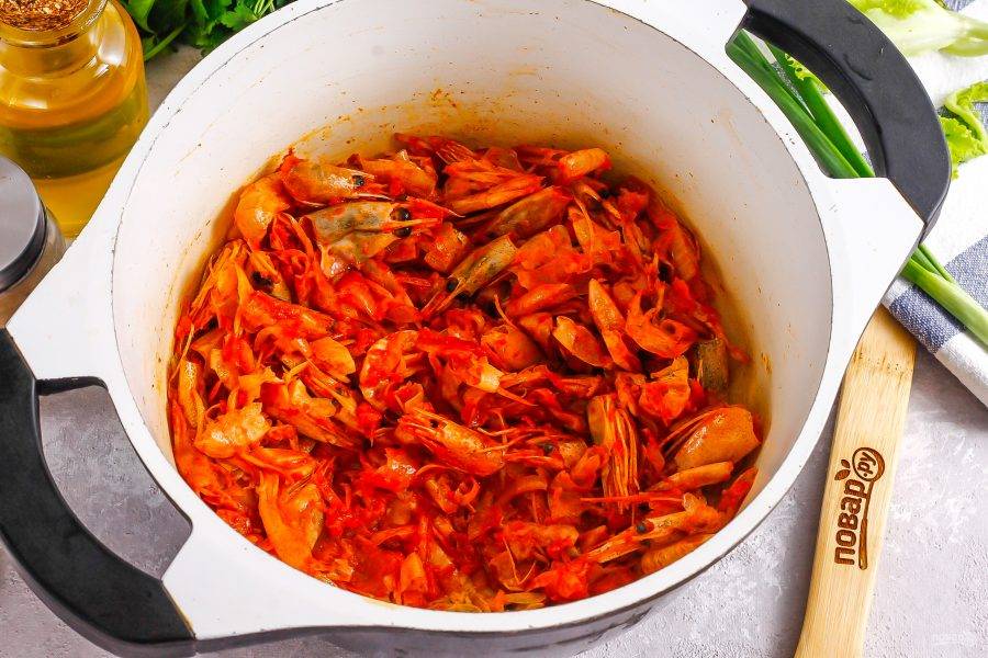 Влейте горячую воду, доведите до кипения и убавьте нагрев. Томите не менее 35-40 минут до размягчения панцирей. За это время вода немного выпарится.