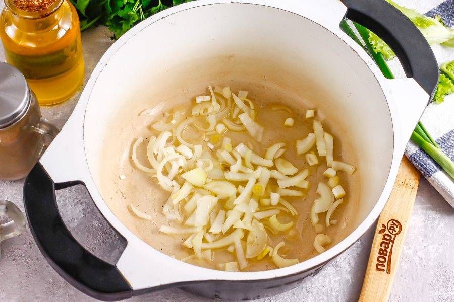 Лук и чеснок очистите от кожуры и промойте в воде. Нарежьте луковицу мелкими кубиками и обжарьте на растительном масле примерно 3-4 минуты до румяности, спрессовав туда же и очищенный зубчик чеснока.