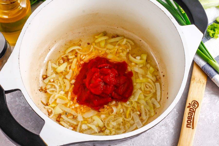 Затем добавьте томатную пасту и все хорошенько перемешайте, протомите примерно 1 минуту.