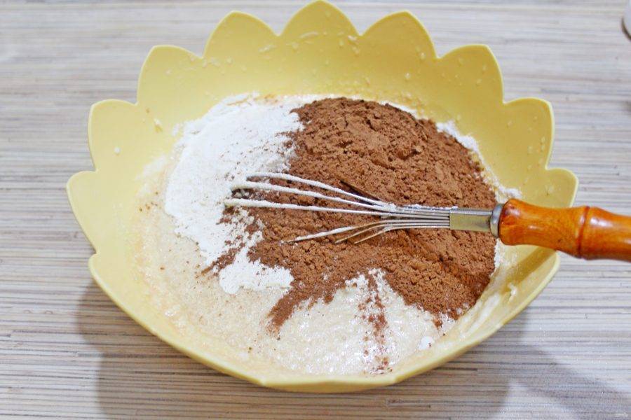 Влейте остывшее молоко с кофе, добавьте просеянные муку и какао.