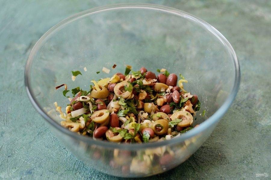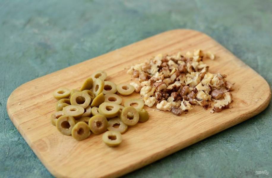 Грецкие орехи подсушите на сухой сковороде, затем мелко порубите. Оливки нарежьте кольцами.