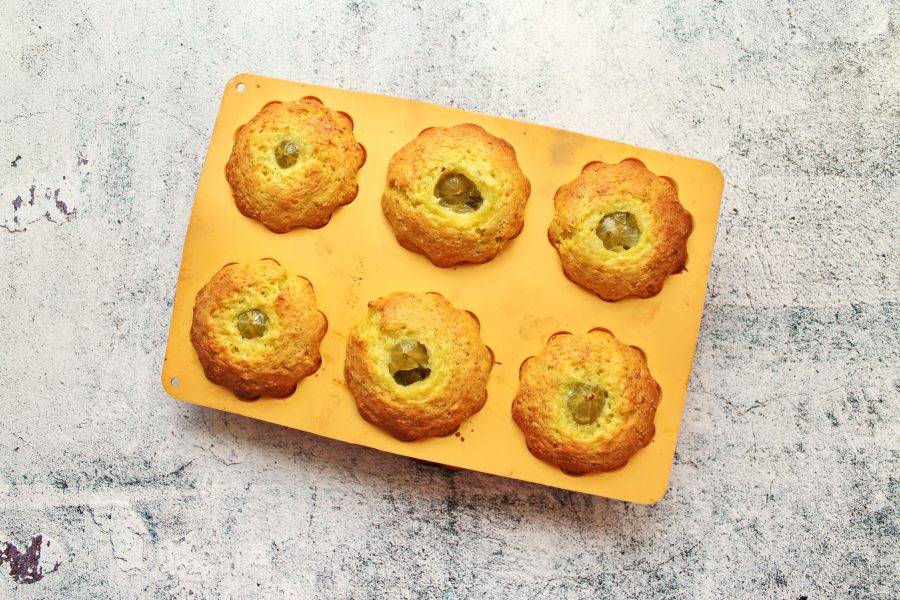Разложите тесто по формочкам на 2/3 высоты. Утопите в середине каждого по одному большому крыжовнику или три маленьких (сложенных вместе по кругу) ягоды.