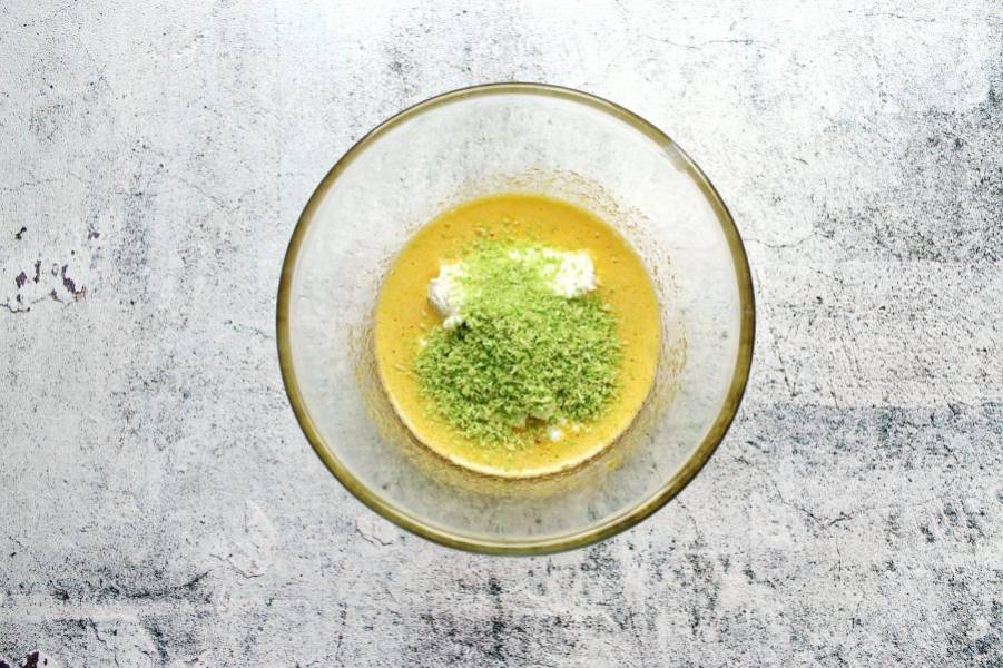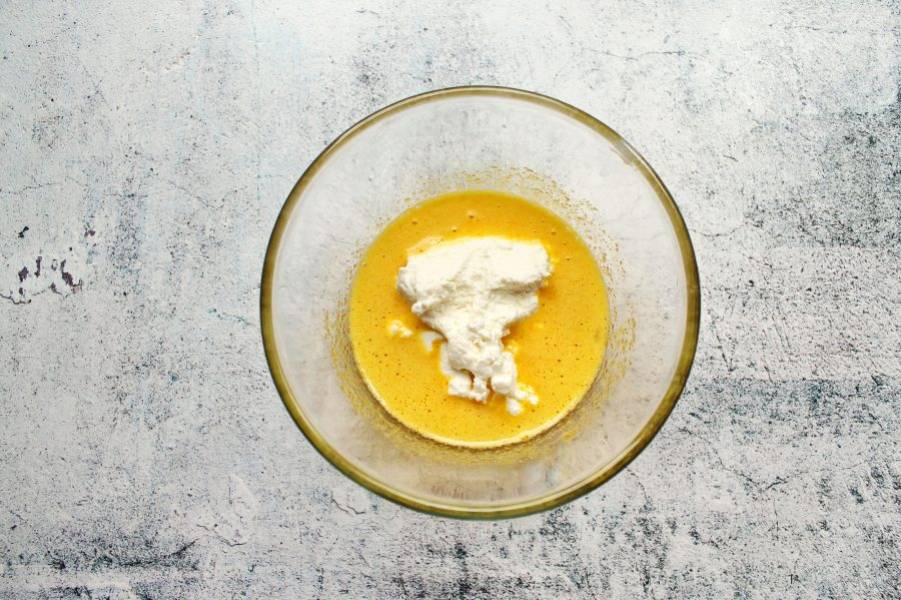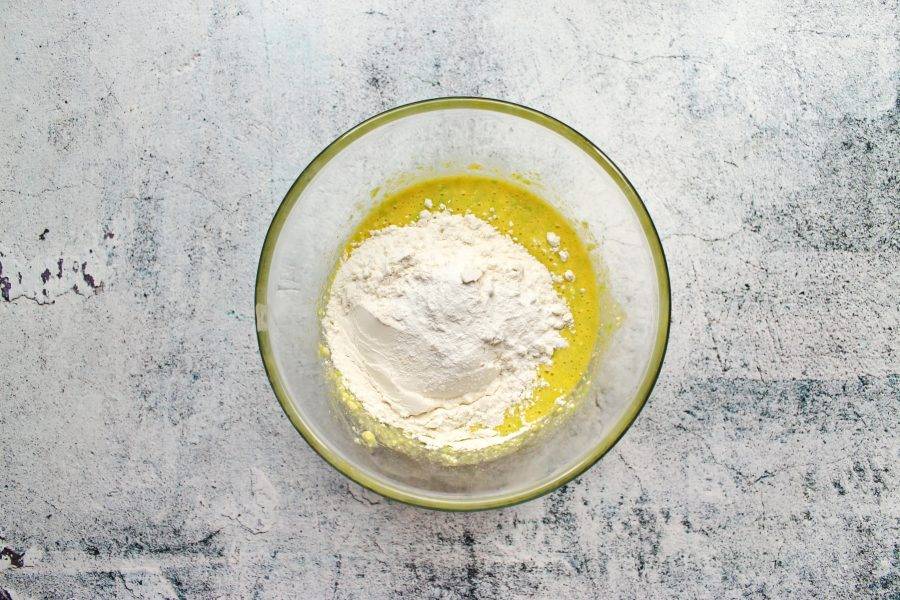 Муку смешайте с разрыхлителем и просейте в миску. Все перемешайте до теста как густая сметана.