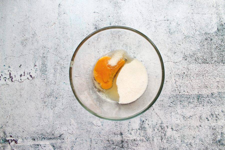 В миску разбейте яйца, добавьте сахар, соль и ванильный сахар. Взбейте венчиком до растворения сахара и соли.