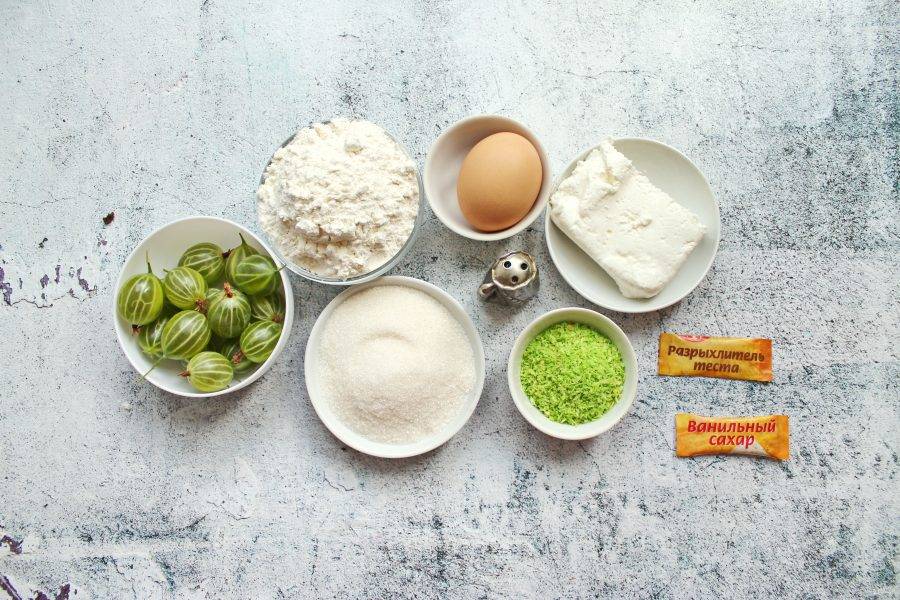 Подготовьте все необходимые ингредиенты для приготовления творожно-кокосовые кексов. Крыжовник переберите, сполосните и удалите хвостики.