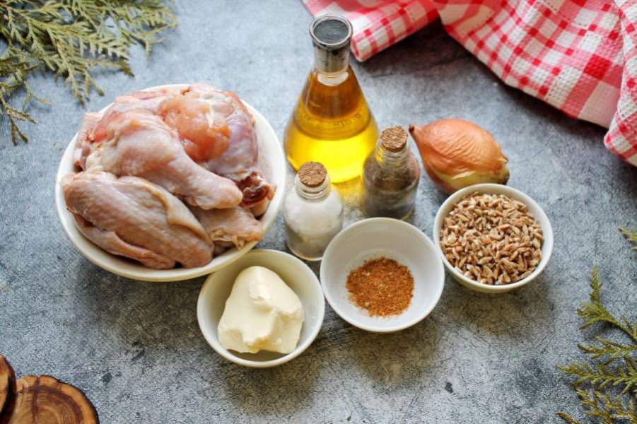 Пока готовится полба, приготовьте курицу. Ее нужно порезать на куски, сполоснуть и обсушить. Курицу посолите, посыпьте специями и перемешайте. В сковороду налейте растительное масло, разогрейте на среднем огне и обжаривайте курицу со всех сторон в течение 15 минут. Курица должна почти приготовиться.