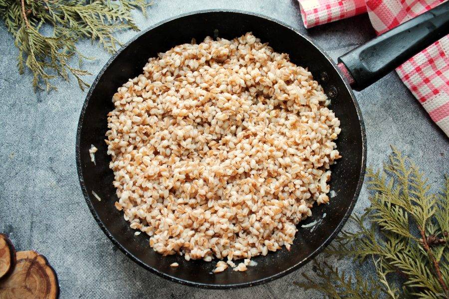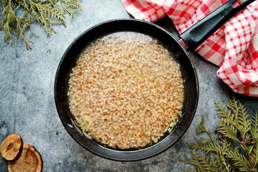 Полбу промойте и дайте воде полностью стечь. Выложите крупу к обжаренному луку и перемешайте. Влейте в сковороду воду, закройте крышкой и убавьте огонь до минимума.