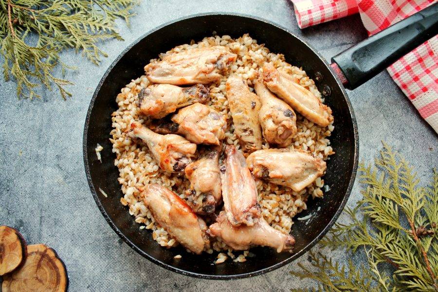 В готовую полбу положите обжаренную курицу, перемешайте, готовьте на медленном огне еще 10 минут и затем подавайте у столу.