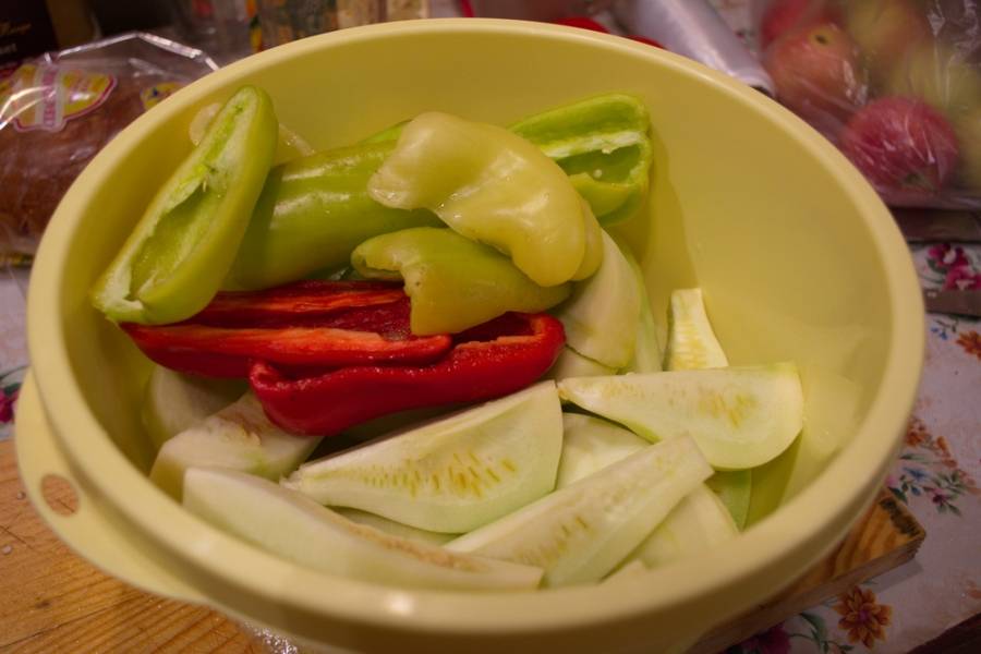 Кабачки нужно очистить от шкурки и крупных семян. Нарезать произвольно. Очистите болгарский перец, помидоры, морковь, яблоки (шкурку оставьте), репчатый лук. Подготовьте все овощи.