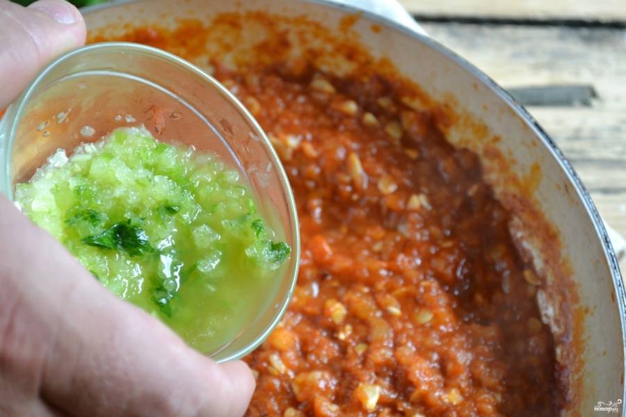 Кабачки порежьте кусочками. Пропустите через мясорубку с мелкой решеткой. Стручок горького перца разрежьте пополам, удалите середину с семенами и тоже измельчите в мясорубке и положите в отдельную тарелку.