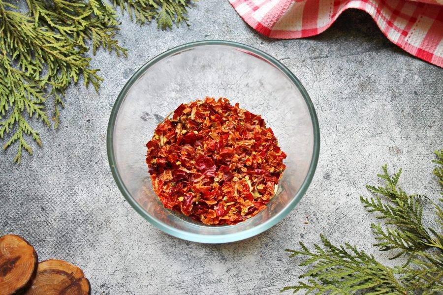 Хорошо поспевший острый перец сполосните и разложите в один слой. Высушите перец любым удобным способом. Главное, чтобы он был полностью сухим и ломким.