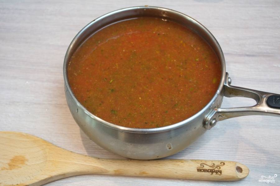Помидоры пропустите через соковыжималку, чтобы сразу убрать у них семена и шкурки. Вместо помидоров смело можно использовать томатный сок. Залейте полученную массу томатным соком.