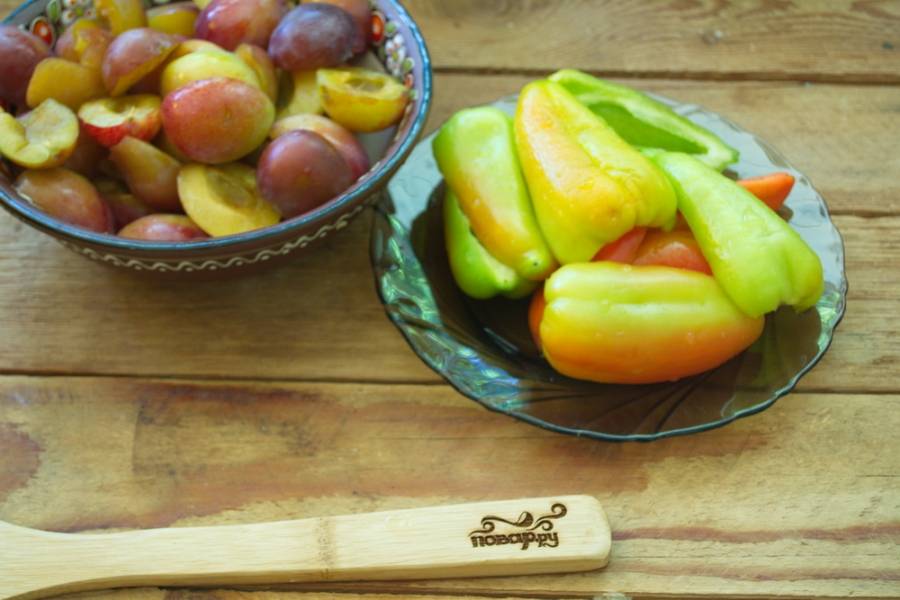 Сливы, очищенный лук, острый жгучий перец, болгарский перец перекрутите через мясорубку дважды.