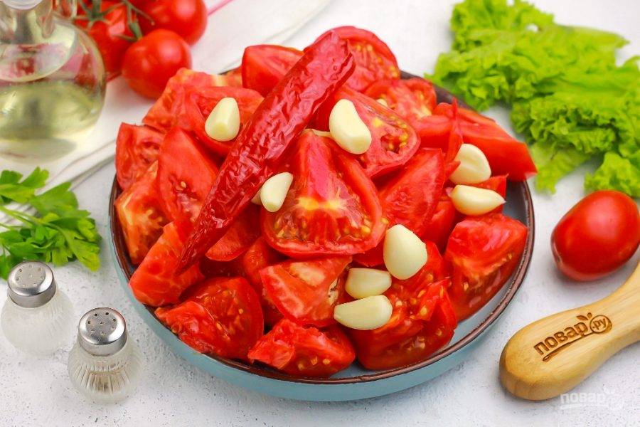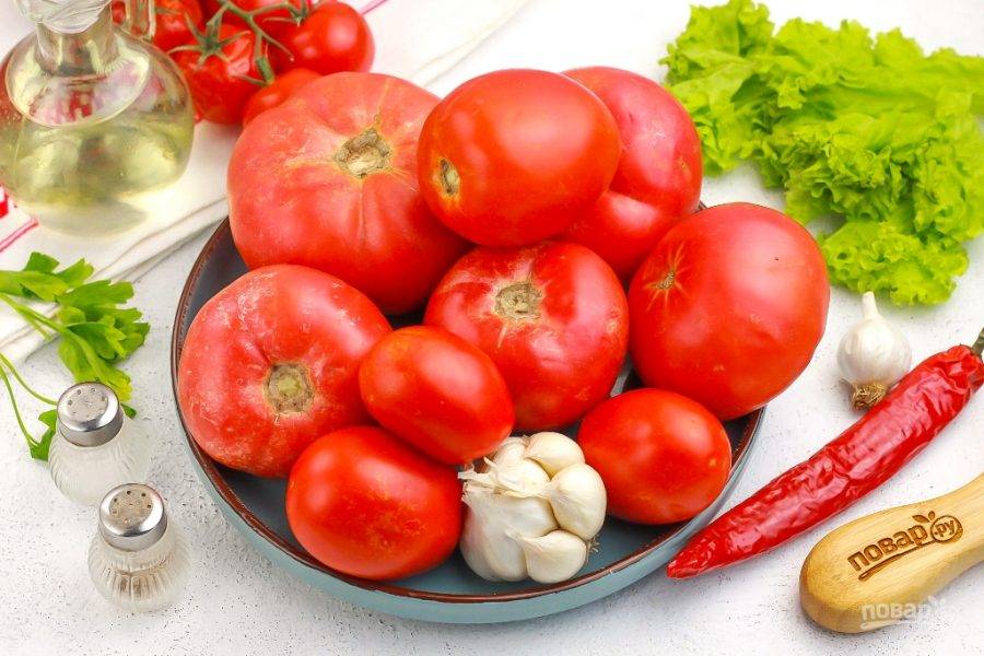 Подготовьте указанные продукты. Томаты промойте в воде вместе с острым перцем. Если перец мелкий, то используйте несколько стручков с семенами. Чеснок очистите от шелухи и промойте в воде.