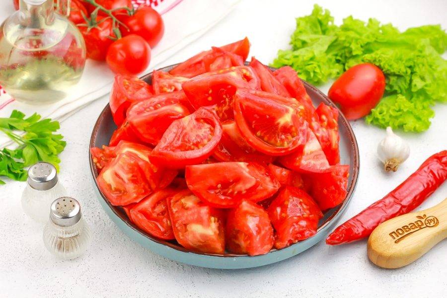 Из помидоров вырежьте зеленые сердцевинки и нарежьте томаты на части, по размеру проходящие в трубу мясорубки.