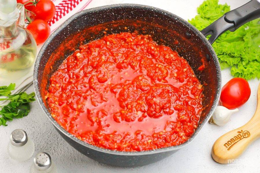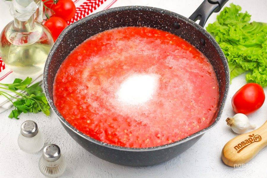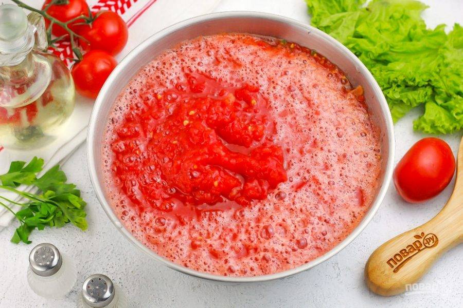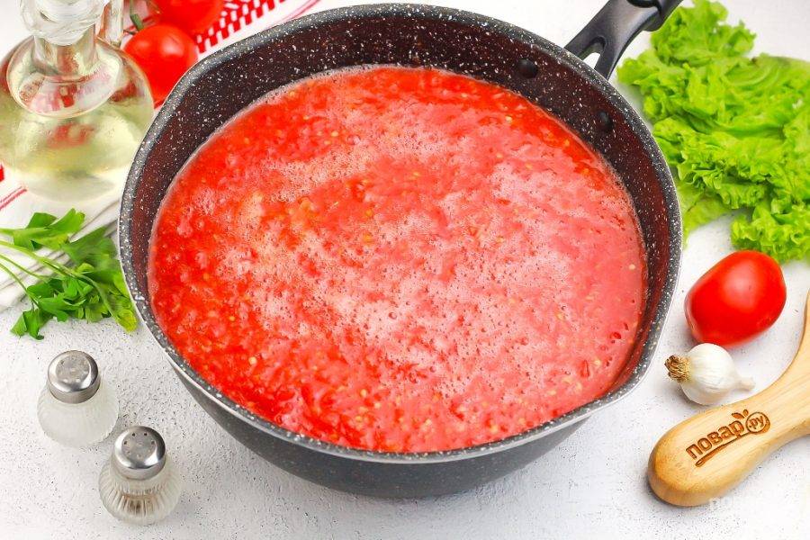 Перелейте всю томатную массу в сотейник или кастрюлю с антипригарным дном. Поместите емкость на плиту и доведите до кипения, а затем убавьте нагрев и прикройте емкость крышкой.