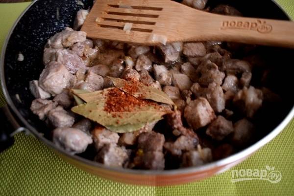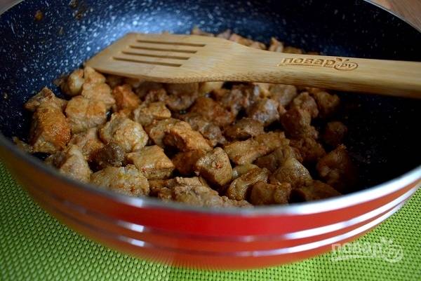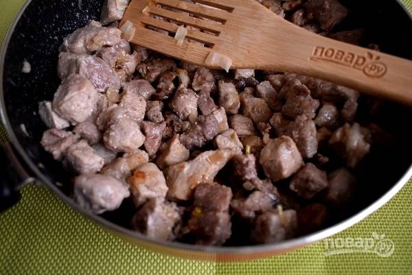 Добавьте мясо, и на сильном огне обжарьте до румяной корочки.