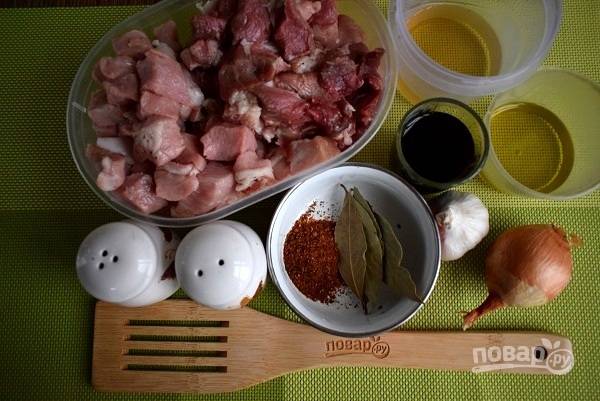 Подготовьте необходимые продукты. Мясо нарежьте квадратиками, размером 2х2см.