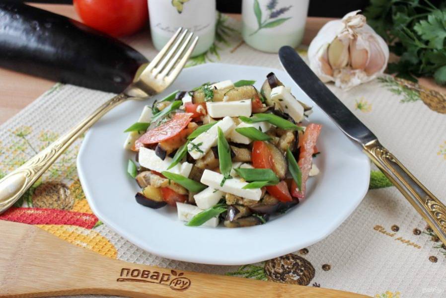 Салат с адыгейским сыром и баклажанами — отличная закуска. Кисло-сладкий помидор, зелень, чеснок и жареный баклажан хорошо сочетаются с нейтральным вкусом этого сыра. Просто, быстро, полезно, вкусно!