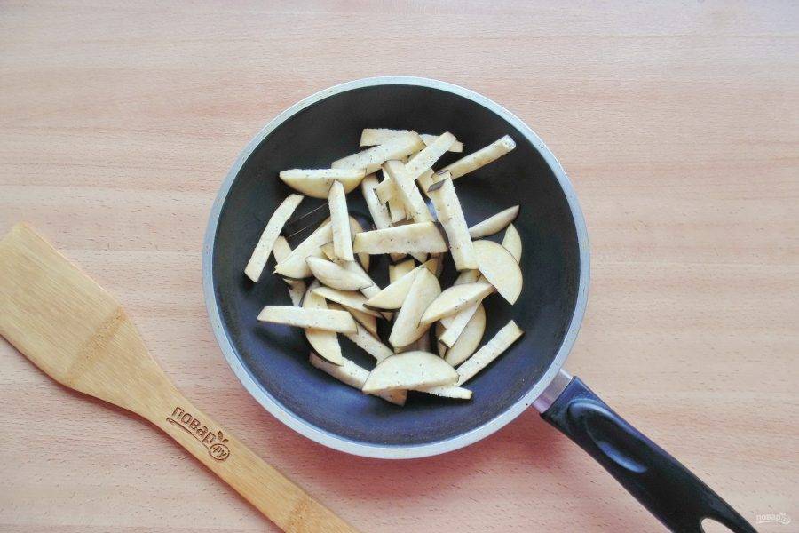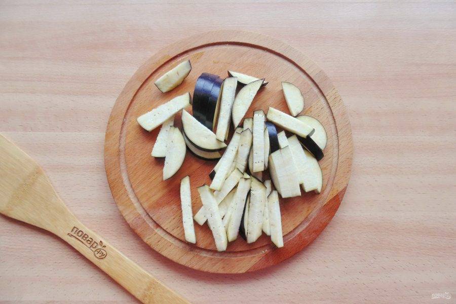 Баклажан помойте и нарежьте брусочками.