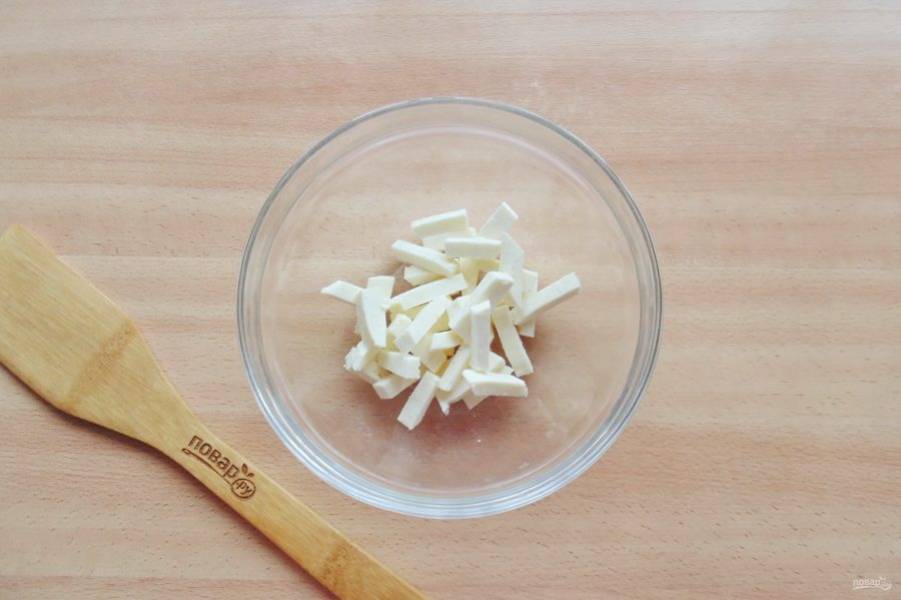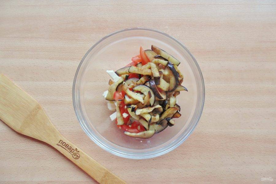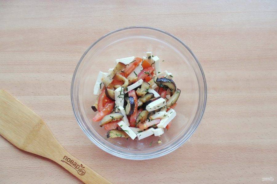 Адыгейский сыр нарежьте такими же брусочками, как баклажан. Выложите в салатник.