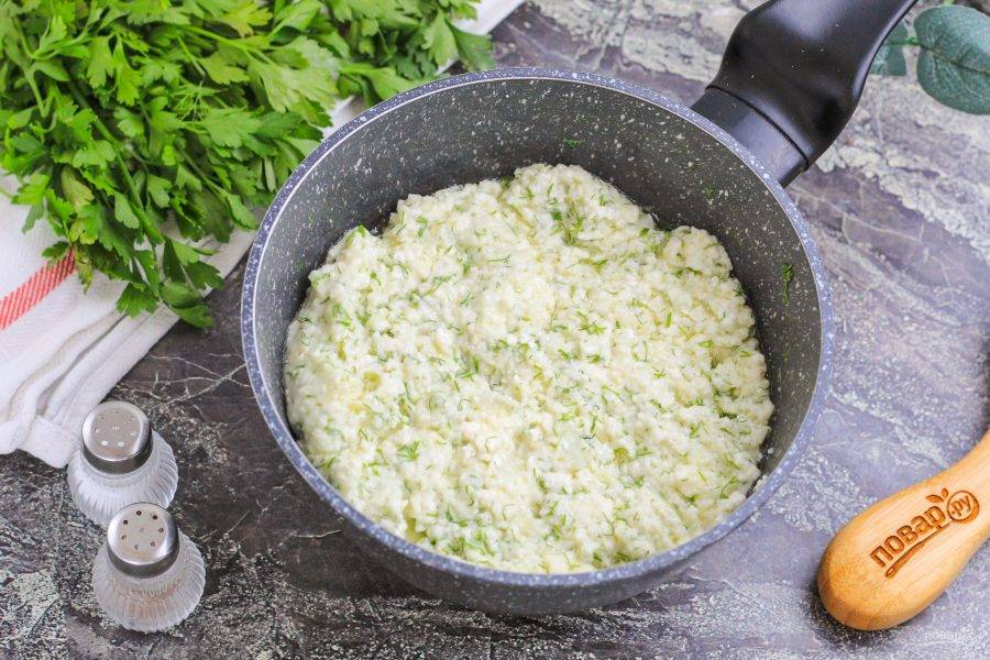 Всыпьте соль и соду. Промойте укроп и измельчите, добавьте в емкость. Можно вместо него нарезать вяленые томаты, всыпать сладкую паприку или куркуму, ориентируйтесь на свои вкусы и вкусы родных.