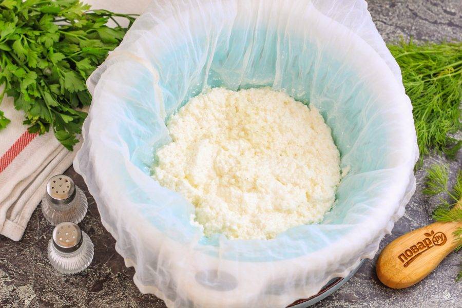Застелите дуршлаг или сито двойным слоем марли или специальной тканью для сыра. Перелейте содержимое емкости в дуршлаг. Сыворотку удалите или используйте для приготовления других блюд. Творожную массу отцедите.