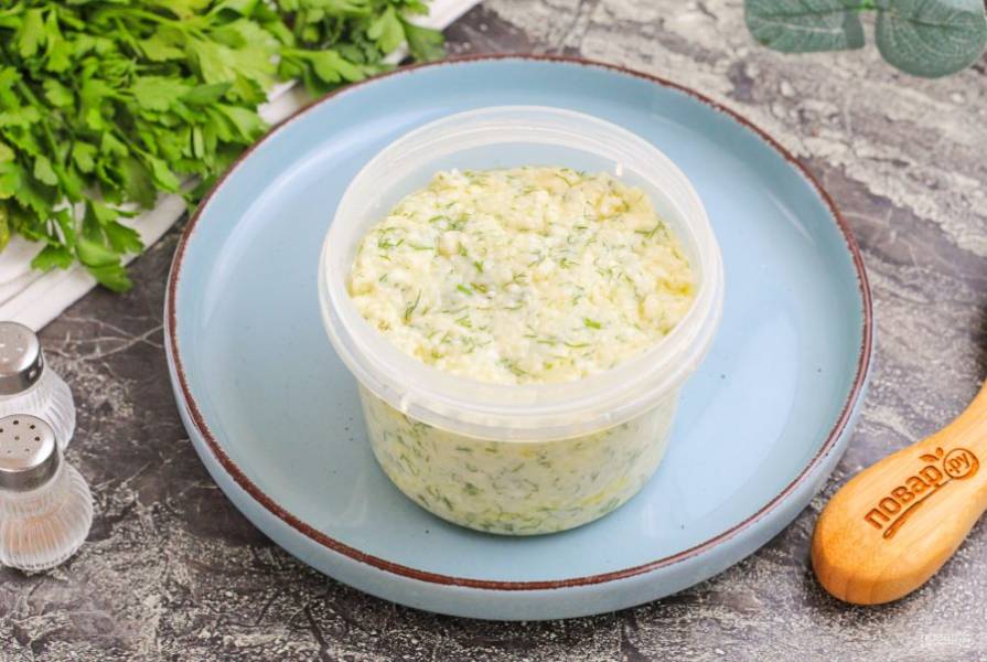 В округлую форму утрамбуйте сырную массу по частям и поместите форму в холодильник до полного остывания на 3-4 часа.