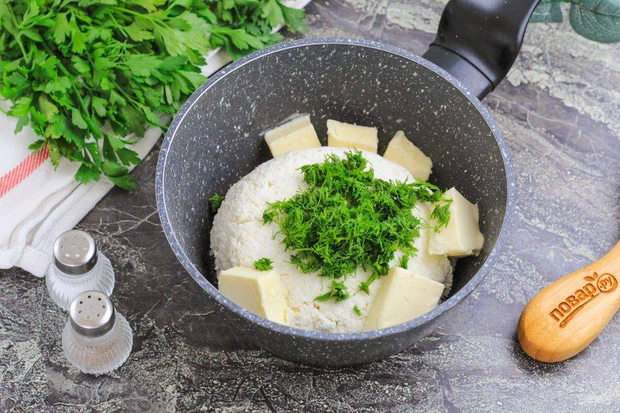 Поместите емкость на плиту и тщательно вымешайте ее содержимое, когда масло растопится. Сода "вспушит" творожную крошку и она отлично перемешается со всеми ингредиентами, станет плавкой. Не доводите массу до обжаривания, выключите нагрев, как только все отлично перемешается.