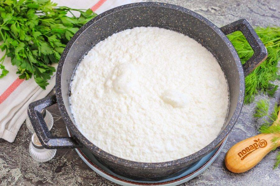 Творог раскрошите и выложите в казан или кастрюлю с антипригарным дном. Влейте молоко, тщательно перемешайте и поместите емкость на плиту. Включите средний нагрев и доведите практически до кипения, не забывая помешивать. Благодаря творогу, молоко расслоится.