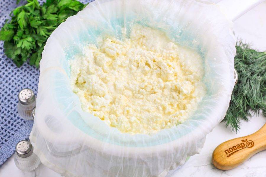 Перелейте содержимое емкости в дуршлаг, застеленный двойным слоем марли или специальной тканью для приготовления сыра, творога. Дайте стечь сыворотке и вмешайте в массу соль. По желанию можно добавить тмин, измельченную зелень, кусочки вяленых томатов и т.д. — по вашему вкусу. Если кефир не жирный, то растопите и влейте в массу сливочное масло. Затем соберите края марли или ткани и завяжите, чтобы получился колобок. Подвесьте сыр над раковиной на 1-2 часа, чтобы стекла лишняя сыворотка.