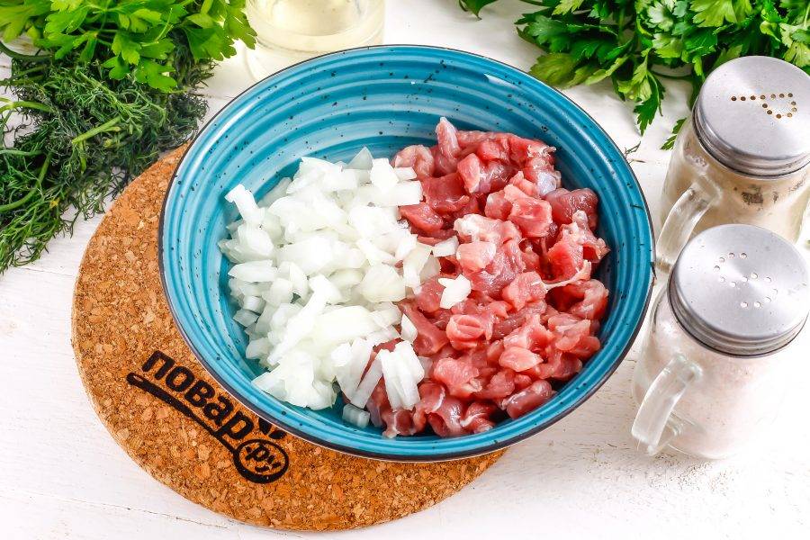 Мясо промойте в воде и вырежьте из него все жилы, срежьте пленки. Нарежьте мелкими кубиками или пропустите через мясорубку, установив решетку с мелкими ячейками. Лук очистите от кожуры и мелко нарежьте.