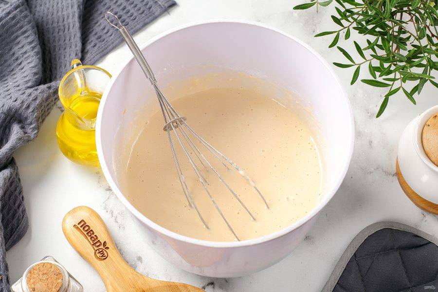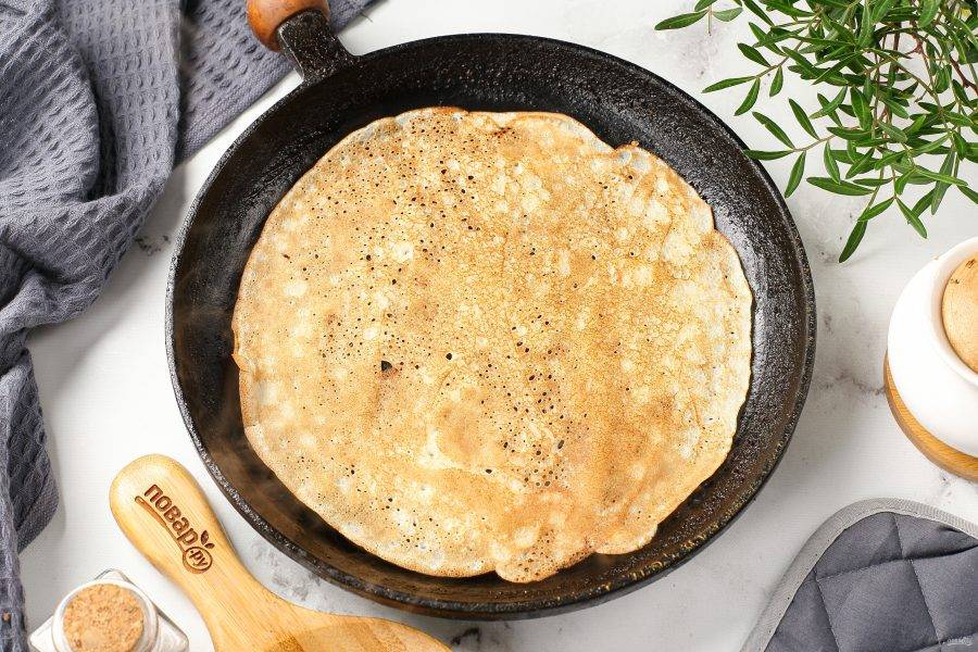 Начните выпекать блины. Для этого блинную сковороду смажьте растительным маслом и при помощи половника налейте небольшое количества теста на сковороду. Другой рукой делайте круговые движения, чтобы достичь равномерного распределения теста по поверхности сковороды. Жарьте блинчики на хорошо разогретой сковороде до румяности, переворачивая с одной стороны на другую.