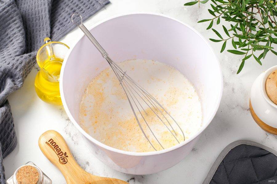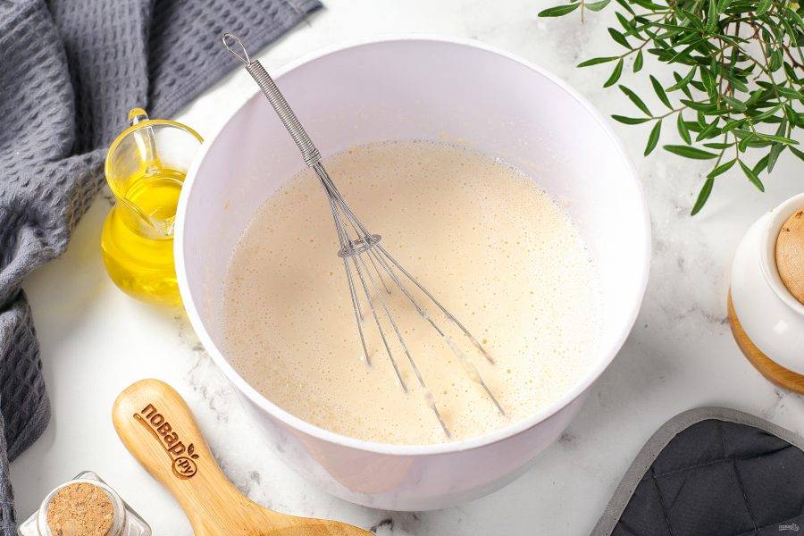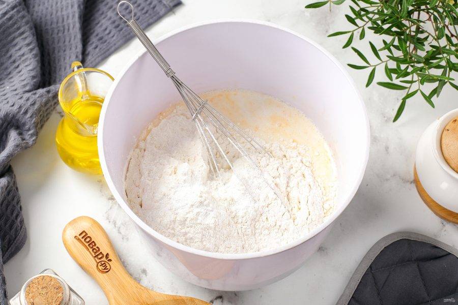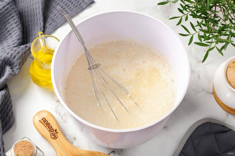 В кипяток добавьте масло, влейте тонкой струйкой в тесто и энергично всё перемешайте ещё раз.