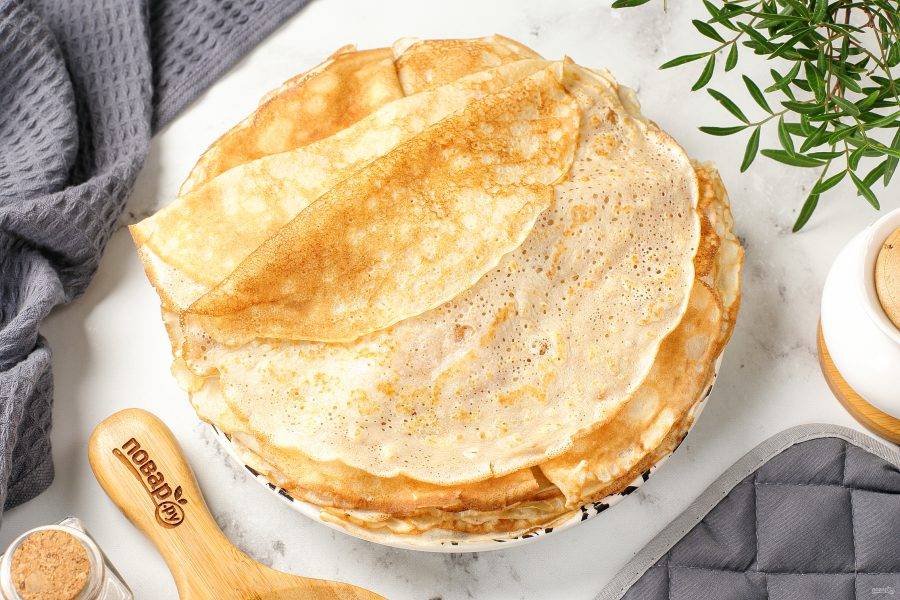Готовые блины складывайте стопочкой, по желанию их можно промазать сливочным маслом.