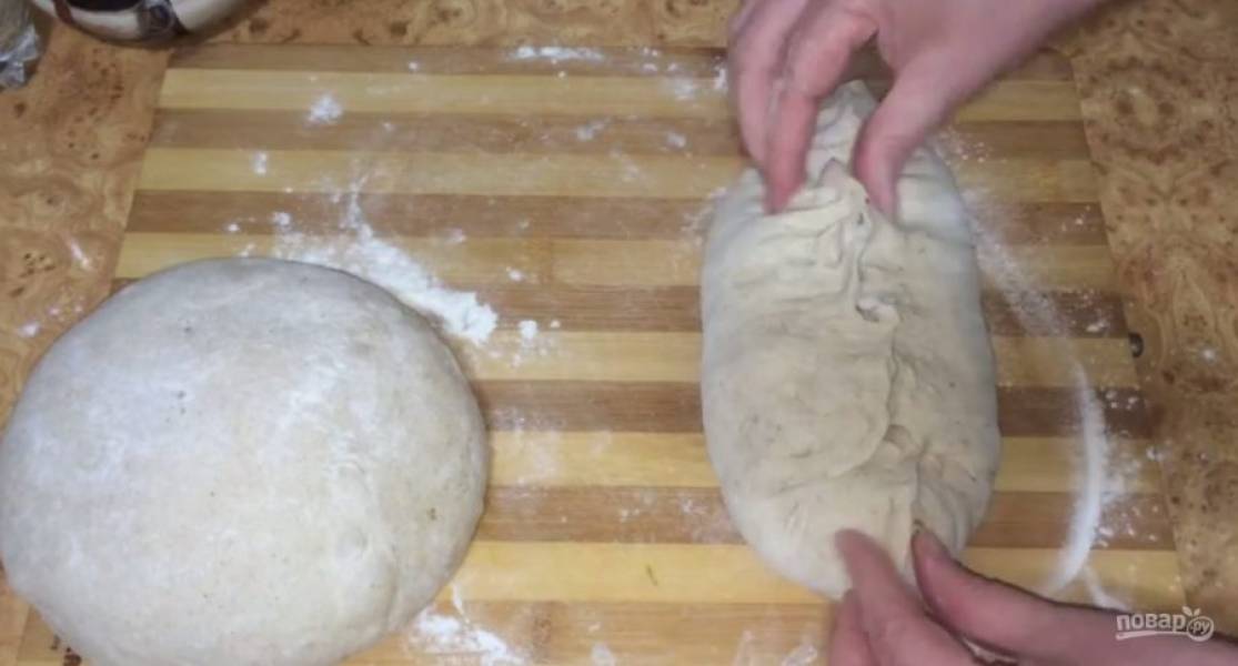 Затем один край теста растяните и заверните к центру. Повторите со всеми краями теста. Округлите тесто и оставьте под пищевой пленкой еще на один час. Снова повторите обминку теста, округлите его и оставьте под пленкой на час.